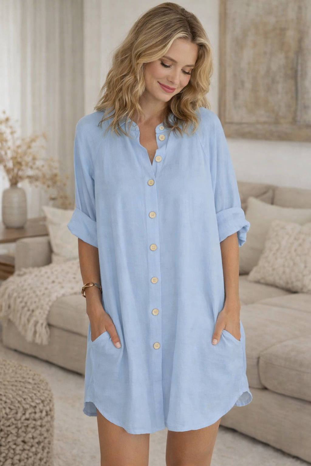 • Eleganter V-Ausschnitt mit durchgehender Knopfleiste